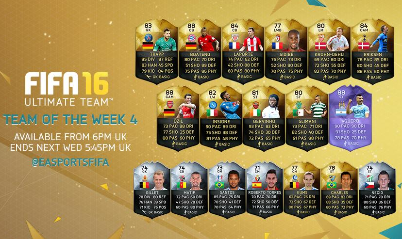 Fifa 16 totw 4 is totw 4 is headlined by sergio aguero who scored 5 goals last week in just 20 minutes after halftime.
